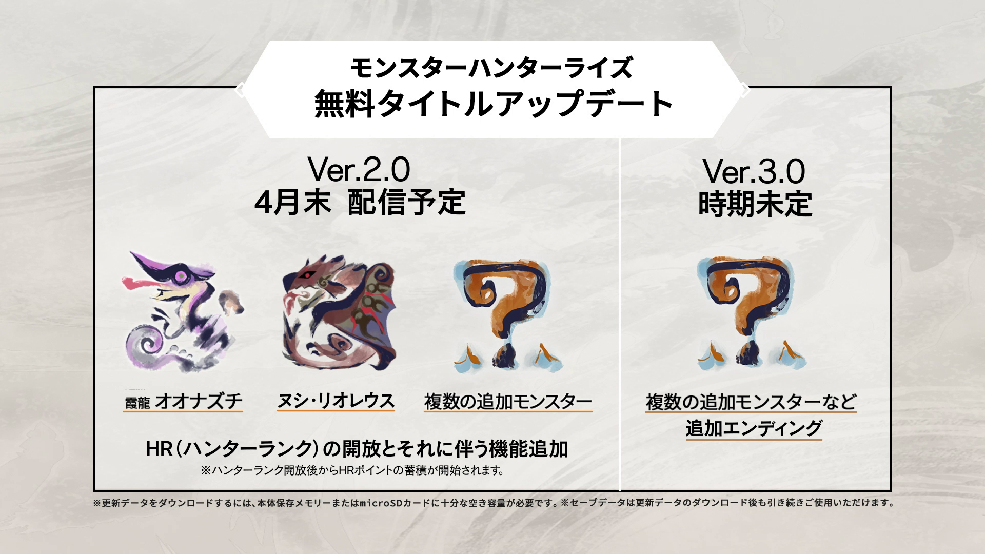 モンスターハンターライズ公式 モンスターハンターライズ 無料タイトルアップデート 4月末配信予定 Ver 2 0 霞龍 オオナズチ ヌシ リオレウス 複数の追加モンスター ハンターランクの開放とそれに伴う機能追加 Hr開放後からhrポイント
